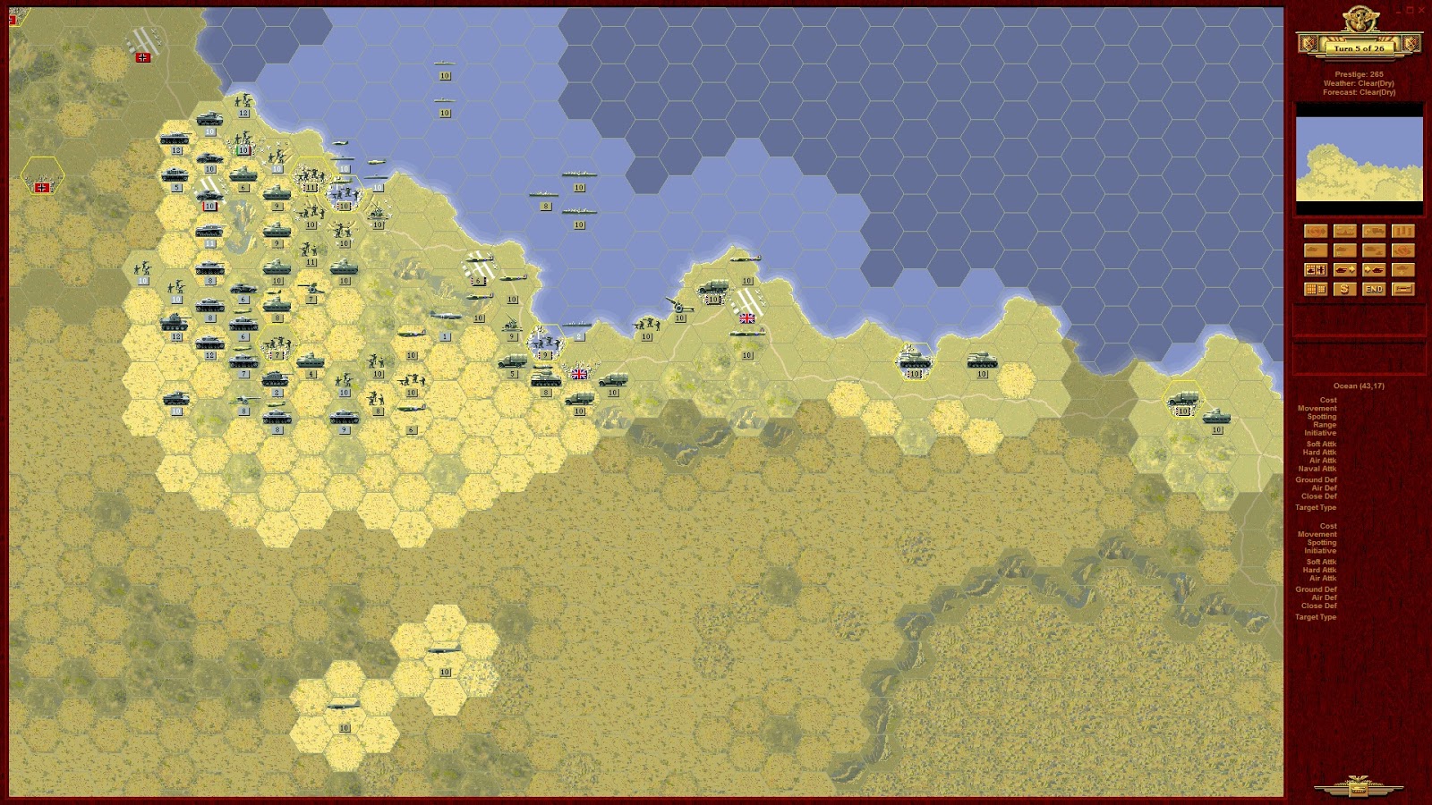 TURN 01 - AXIS - Enemy attacks at full force. An english infantry unit is lost, one is reduced to three points and another one to one point, while a destroyer is sunk. Could have been better. Situation at the end of Axis turn: